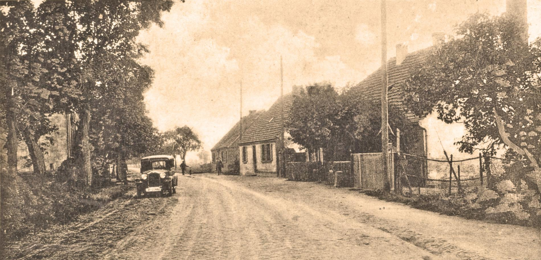 Böhner Dorfstraße, südlicher Dorfausgang, Richtung Bützer/ Vieritz. Auf der linken Straßenseite ist der Opel P4 und direkt gegenüber das Wohn- und Geschäftshaus von Bäckermeister Fritz Küsel abgebildet. Sammlung Wodtke
