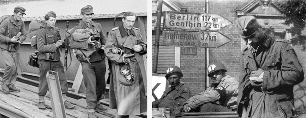 Flucht deutscher Soldaten Anfang Mai 1945 über die zerstörte Tangermünder Brücke in amerikanische Gefangenschaft. Sammlung Wodtke