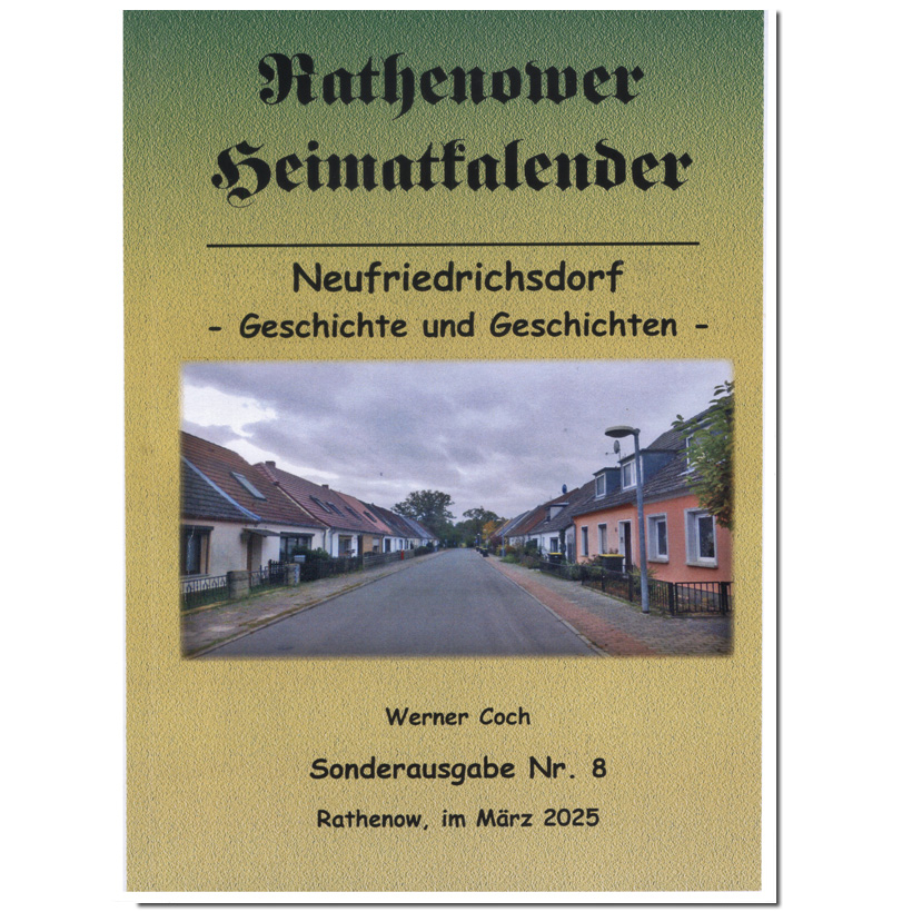 Als Fazit sehen wir einen Nachholbedarf darin, die Entwicklung des Dorfes 260 Jahre nach dem Baustart umfassend zu würdigen. Dieser Aufgabe fühlte sich unser Autor Werner Coch verpflichtet, und er legt hiermit das Ergebnis seiner Arbeit vor, das auch einen Einblick in die Geschichte der früher so wichtigen Rathenower Textilindustrie gibt. Als Verein hoffen wir, dass die jetzt fertiggestellte Ausarbeitung auch über Neufriedrichsdorf hinaus viele Interessenten finden wird.