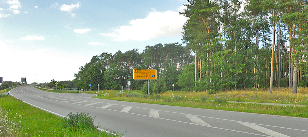 Abzweig von der L96 zur B188. Hier geschah in der Nacht des 25. Juli 1947 der Mord an dem Landpolizisten Oskar Meißner. Zum Tatzeitpunkt war der heutige, von der Verbindungsstraße getrennte Hochwald eine geschlossene Kiefernschonung mit jungem Baumbestand. Foto: Wodtke