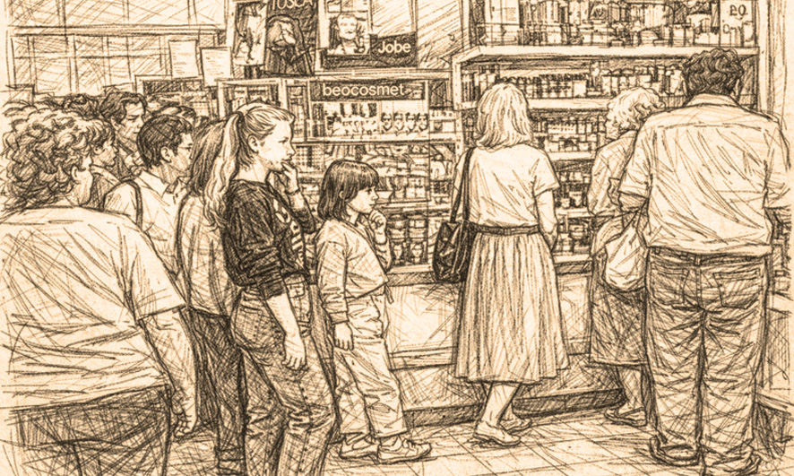 Die letzten Tage im Rathenower Intershop kurz vor dessen Auflösung im Juni 1990. Grafik mit KI-Unterstützung generiert