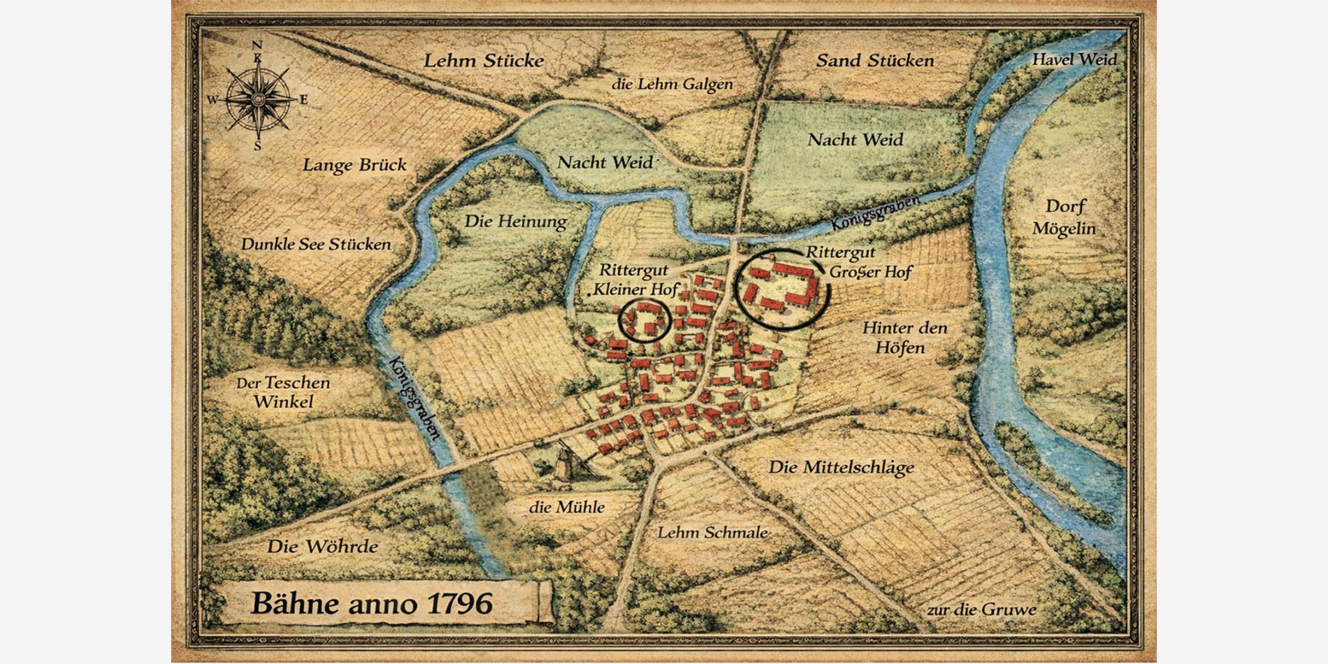 Etwaige Ortslage von Böhne um 1796. Zu diesem Zeitpunkt waren die beiden Rittergüter des Ortes im Besitz von Johanna Christina Friederike (Jenny) von Möllendorf, geb. von Briest. Repro Wodtke